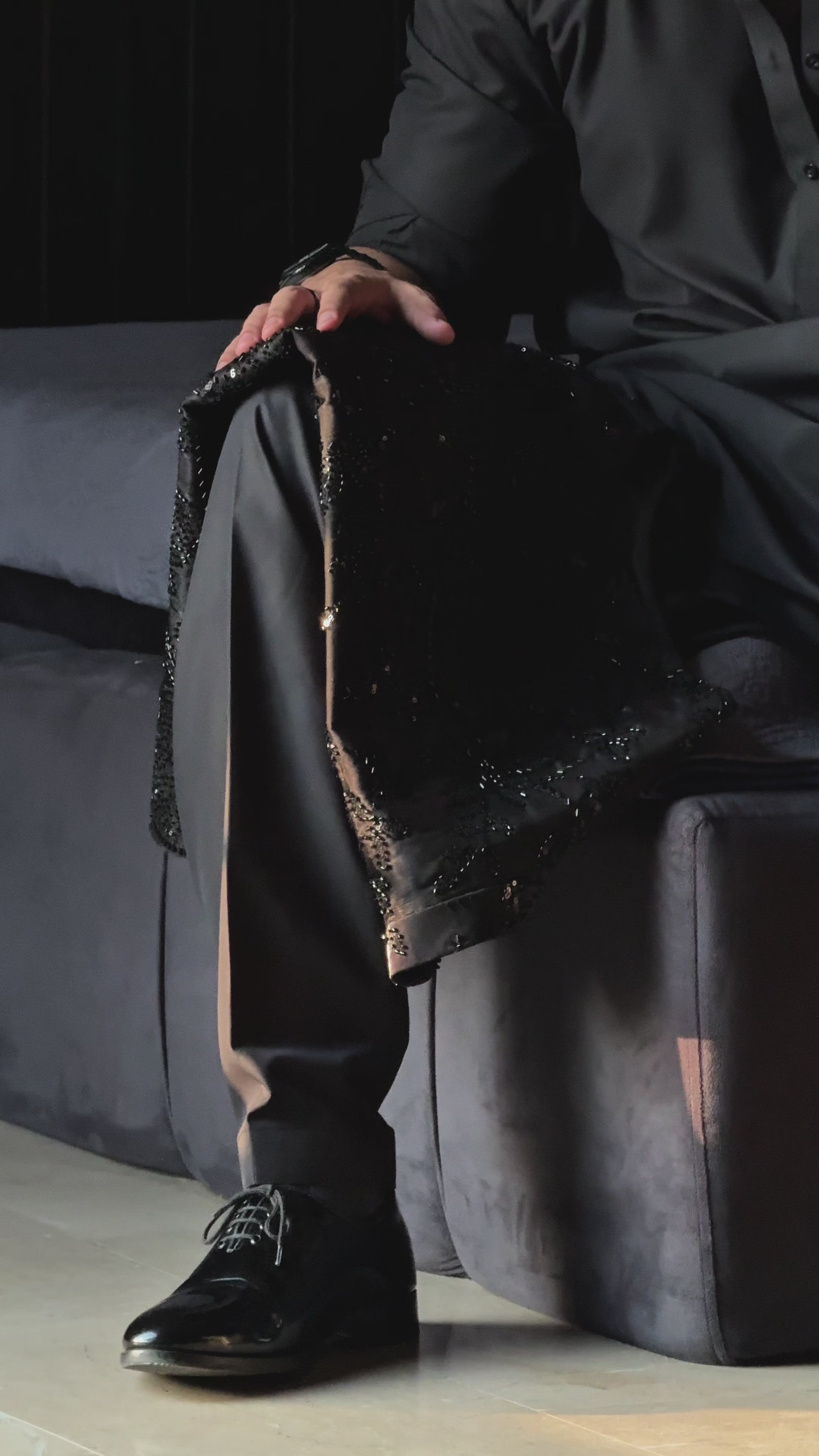 Stepping out in this all-black ensemble. 🌑 The intricate sequin and bead work on the waistcoat is doing all the talking—a modern take on traditional elegance. Paired with a sleek black kurta and sophisticated black shalwar, this can be your favorite way to make a statement. Sometimes, all you need is black and a little bit of sparkle.